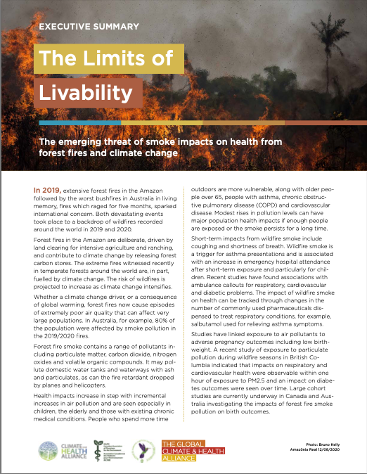 - Main report: The Limits of Livability – The emerging threat of smoke impacts on health from forest fires and climate change (pdf)