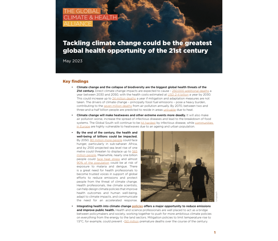 This GCHA briefing outlines how and why tackling climate change could be the greatest global health opportunity of the 21st century and provides links to key latest research.