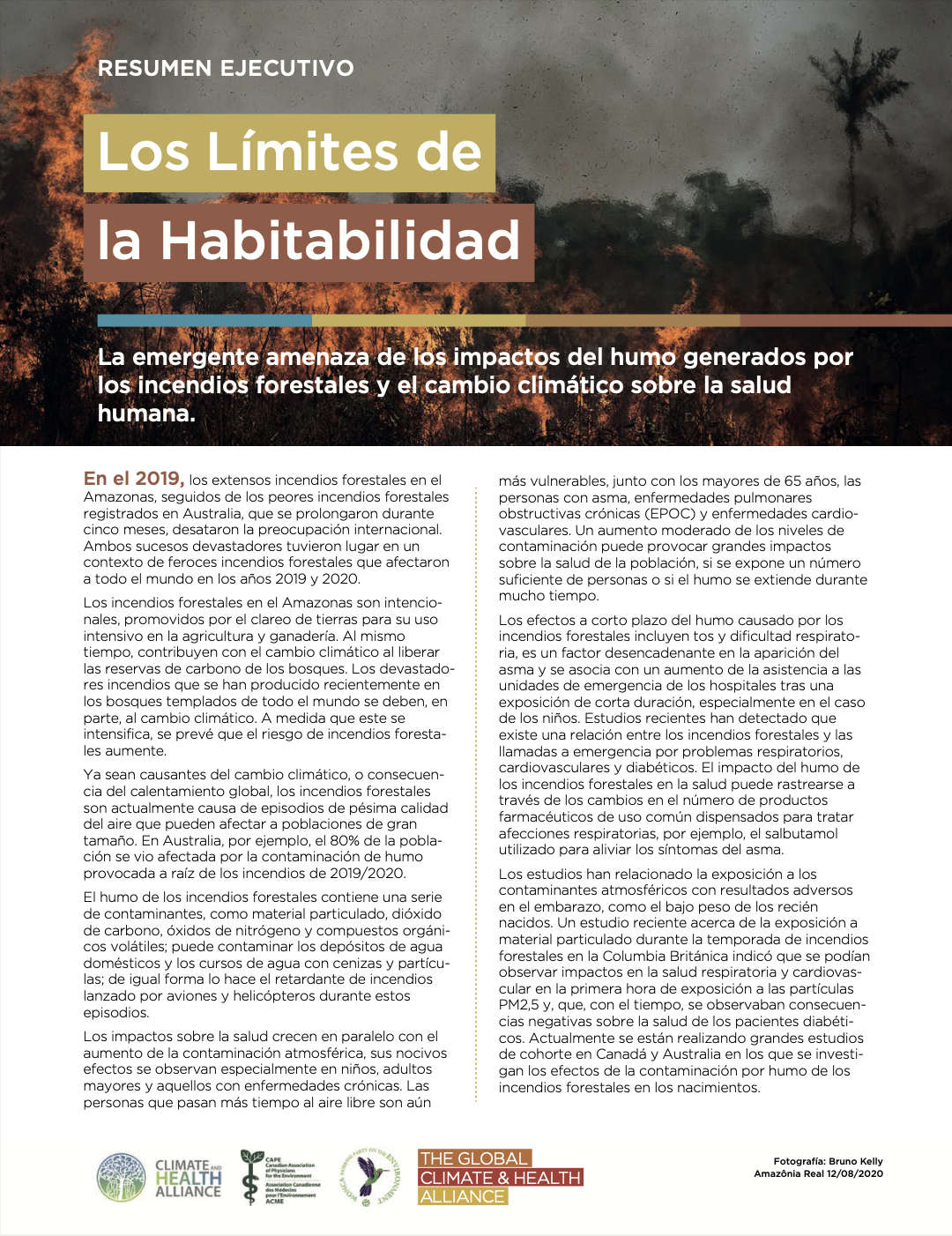 Los límites de la habitabilidad: la amenaza emergente de los impactos del humo en la salud por los incendios forestales y el cambio climático, con estudios de casos de Australia, Brasil y Canadá, advierte que, en todo el mundo, los gobiernos deben actuar para preparar los sistemas de salud pública para los impactos recurrentes en las poblaciones por episodios de contaminación del aire debidos a incendios provocados por la crisis climática, las prácticas de deforestación y la mala gestión de la tierra.