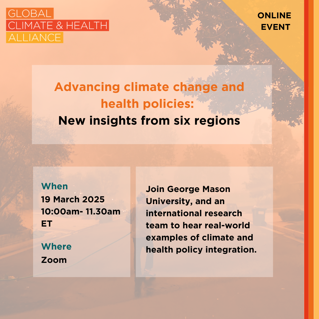 Únase a nosotros para una sesión informativa de 90 minutos sobre las últimas investigaciones de más de 30 expertos en seis regiones, explorando cómo se cruzan las políticas climáticas y de salud, organizada por GCHA y la Universidad George Mason. A partir de más de 225 entrevistas con partes interesadas, descubriremos barreras clave y estrategias viables para impulsar políticas ambiciosas e integradas.