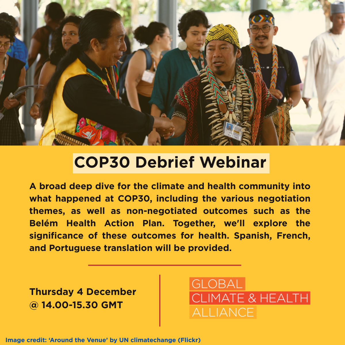 As we collectively reflect on the outcomes of the most recent UN Climate Change Conference in Belém, GCHA warmly invites you to join us for our COP30 Debrief Webinar. This webinar will serve as a broad deep dive for all members of the climate and health community into what happened at COP30, including the various negotiation themes as well as non-negotiated outcomes such as the Belém Health Action Plan. Together, we’ll explore the significance of these outcomes for health. Spanish, French, and Portuguese translation will be provided. Register here.