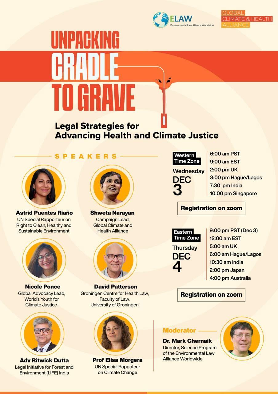 El seminario web explorará el creciente reconocimiento legal de que el cambio climático representa una amenaza para los derechos humanos y la dignidad, incluyendo opiniones recientes de la CIJ y la Corte Interamericana, que han vinculado los combustibles fósiles con violaciones de derechos humanos e impactos en la salud. Comenzaremos con un resumen del informe “De la cuna a la tumba” de la GCHA sobre los daños a la salud causados por los combustibles fósiles, seguido de una mesa redonda sobre cómo los defensores de la salud y el derecho pueden utilizar estas opiniones consultivas para fortalecer la acción climática nacional y global.
