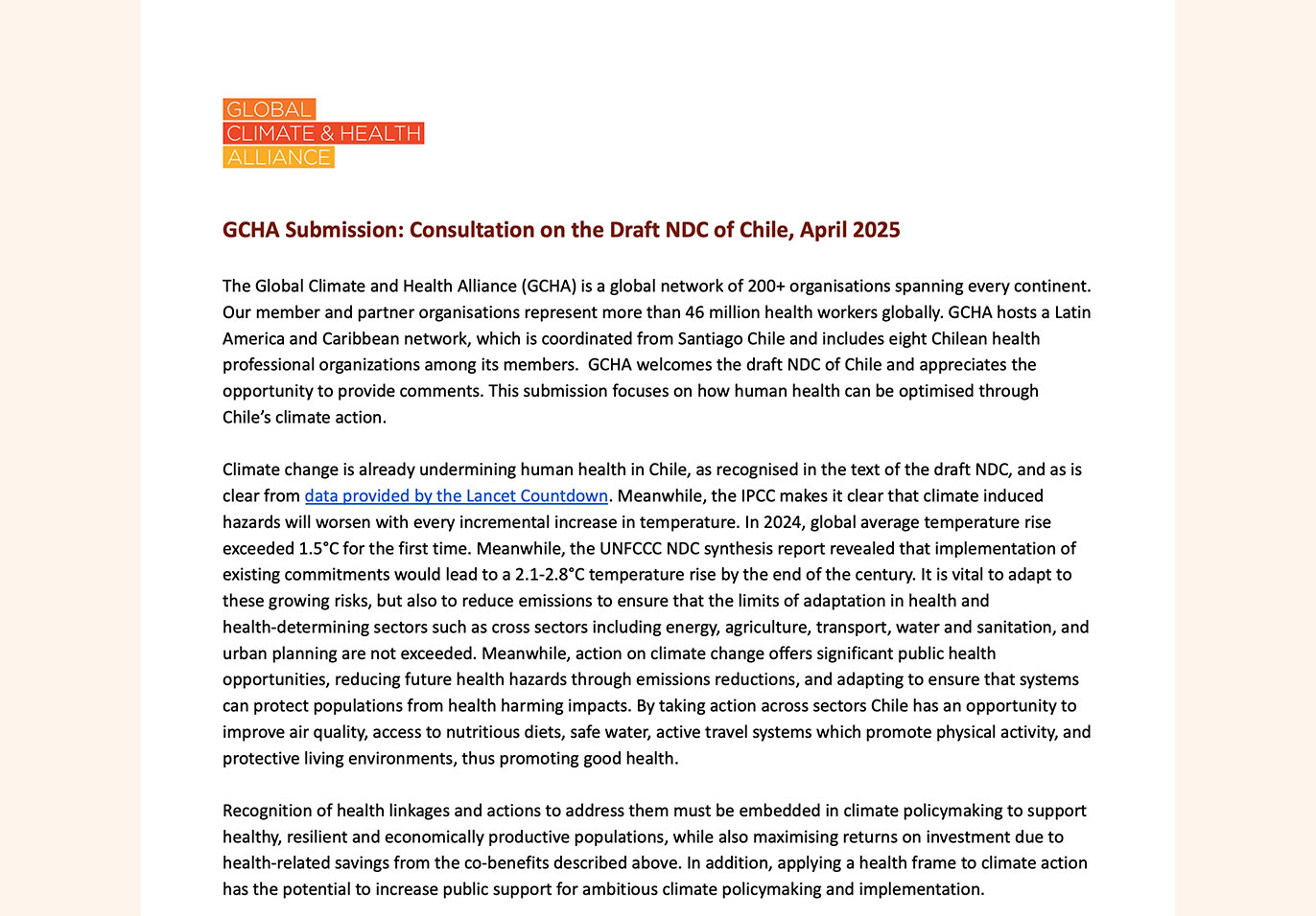 Together with partners, GCHA prepares submissions to national consultations on NDCs. Examples for Chile, Nepal, and South Africa in collaboration with MSF Southern Africa can be found below.
